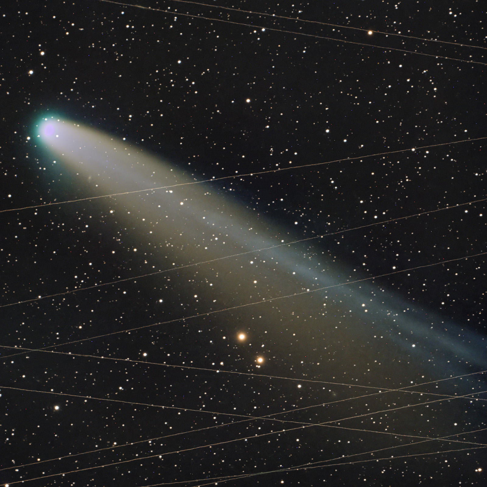 Am fotografiat cometa C/2025 A6 LEMMON, imediat după apus, către vest, pe 24, 27 și 29 octombrie din Orlești (Vâlce, bortle 4-5), folosind o montură EQ6-R Pro, un telescop SW Esprit 100ED cu reducător TS-Optics (@443mm, f/4.4), cameră Asi 533MC (gain 101), filtru Baader Uv/Ir, AsiAIr+, 2 baterii astro si 2 benzi încălzitoare.